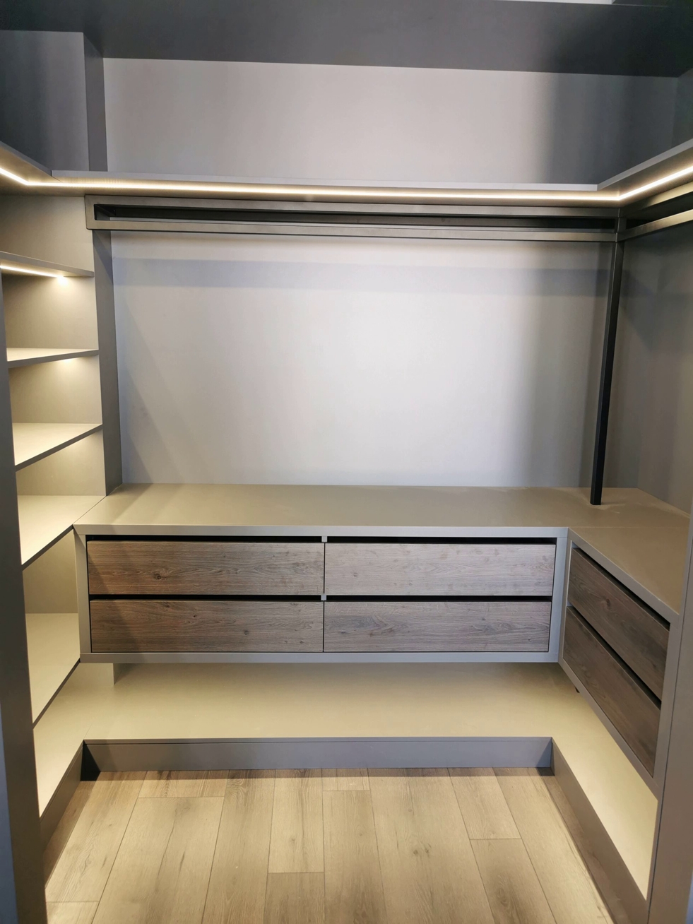 Когда дело доходит до хранения, функциональность имеет первостепенное значение. Конфигурация гардеробной предназначена для удовлетворения ваших конкретных организационных потребностей. От гардероба для длинной одежды до ящиков для аксессуаров, все эргономично расположено для удобства использования в повседневной жизни. Интуитивно понятный макет гарантирует, что вы быстро найдете то, что ищете, и что вы заботитесь о своей одежде и аксессуарах оптимально. Ваш гардероб адаптируется к стилю вашей спальни или пространства.