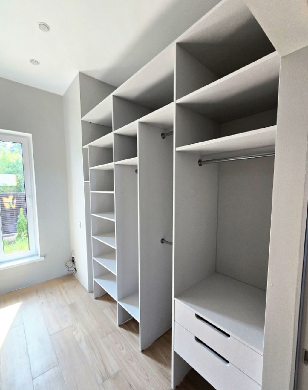 Выбор пользовательской гардеробной - это инвестиция в ваше жилое пространство. Это способ максимально использовать каждый уголок вашего дома, добавляя нотку элегантности в вашу комнату. Изготовленные на заказ гардеробные не только хранят вашу одежду, они также организуют вашу повседневную жизнь, облегчая утреннюю подготовку и сохраняя качество вашей продукции. Наш персонализированный сервис адаптируется к вашим потребностям, и мнения наших клиентов подтверждают, что это идеальный вариант для хорошо упорядоченного гардероба.