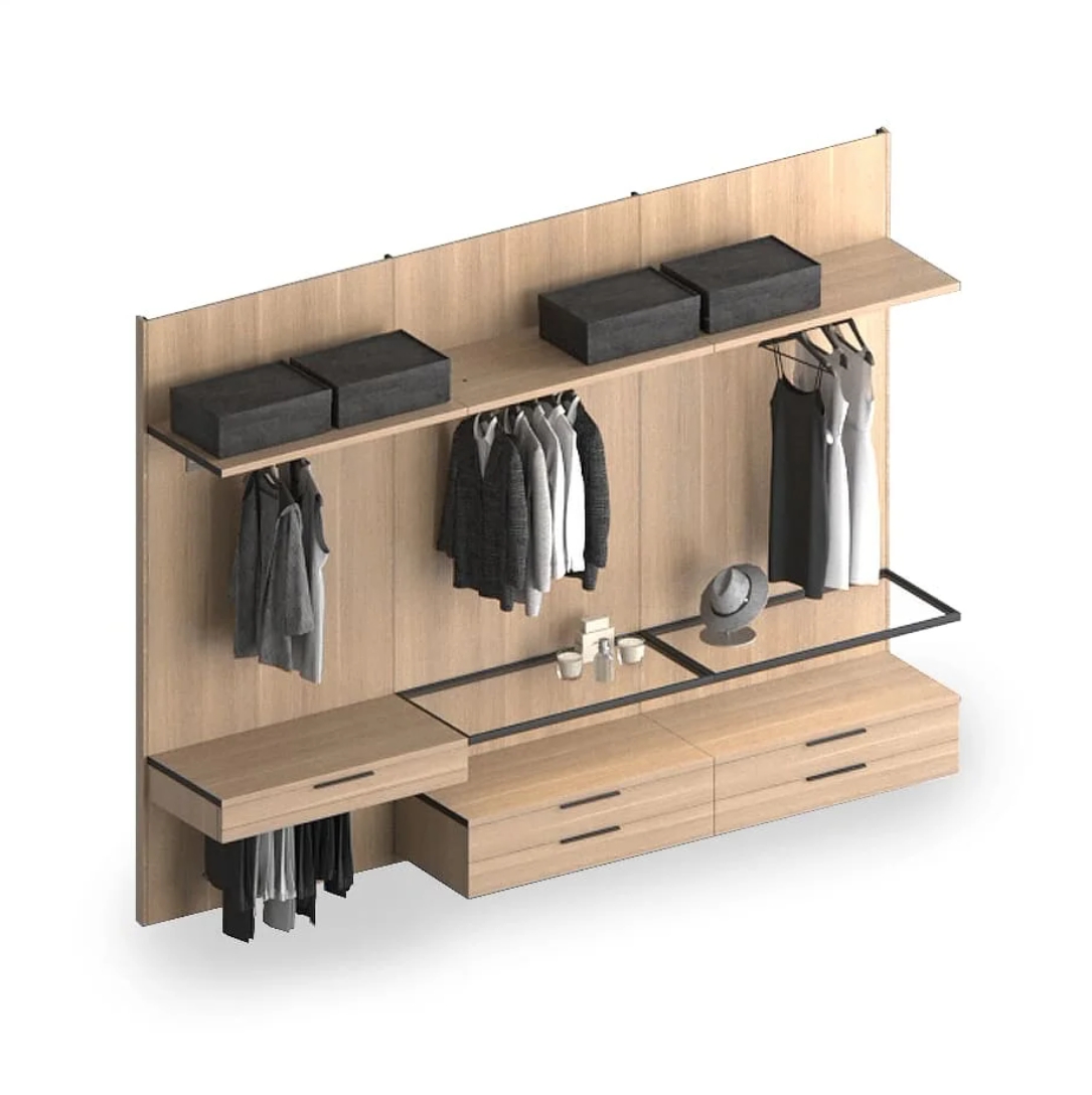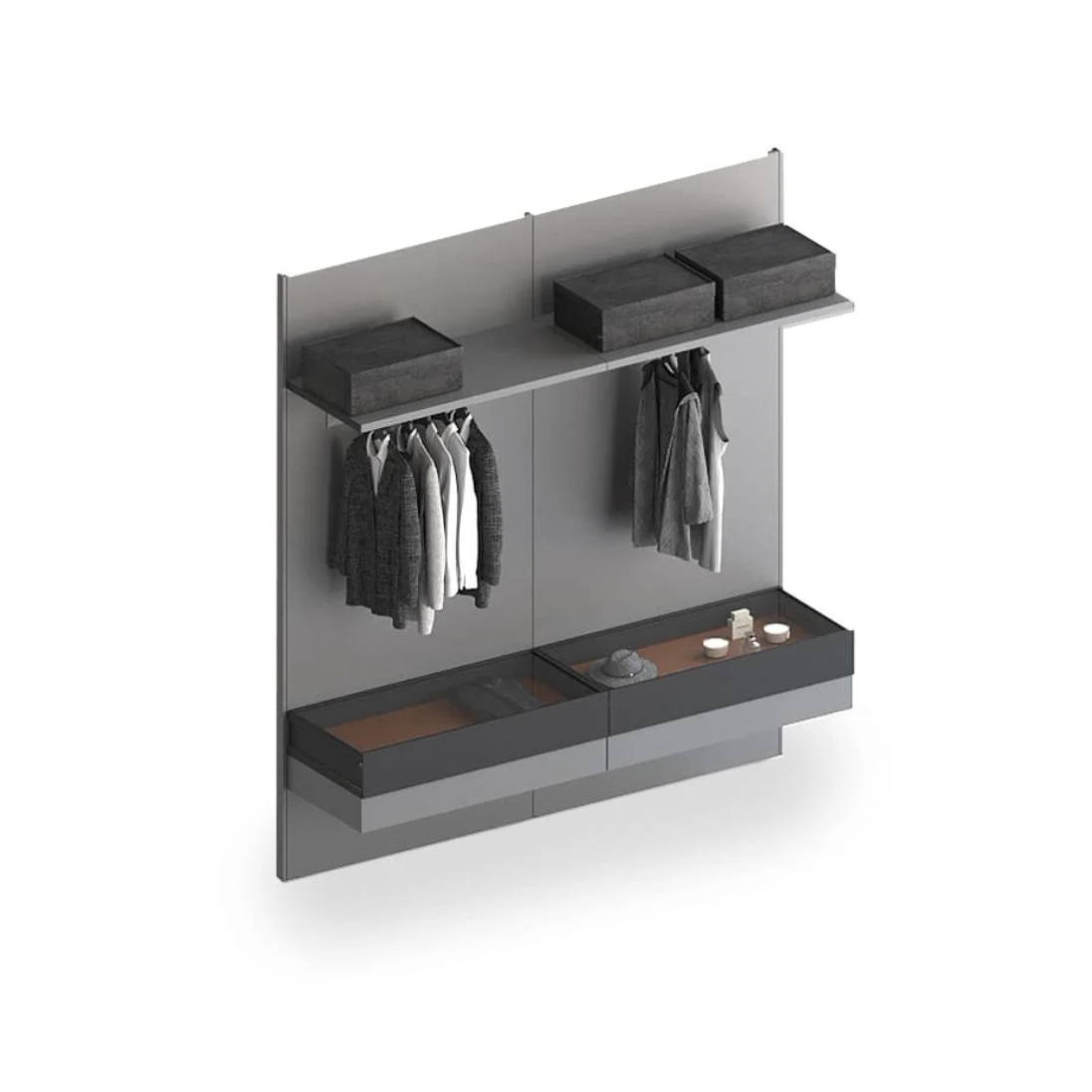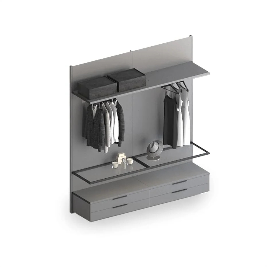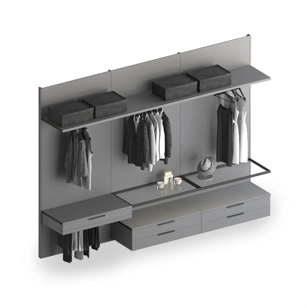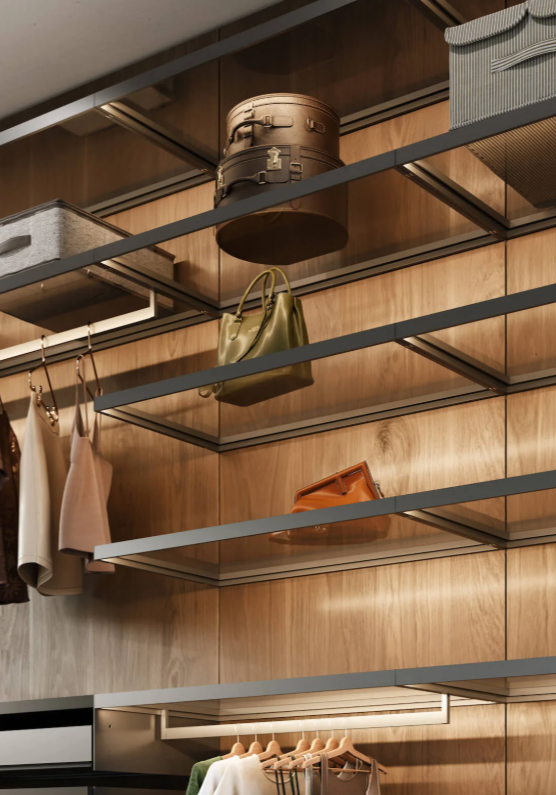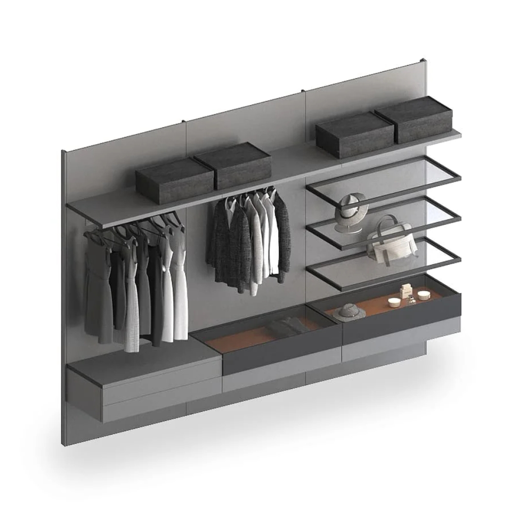 Навесные гардеробные GARDEROB-PRO — это идеальный выбор для тех, кто ценит чистую геометрию и лаконичность. Отказ от вертикальных стенок, верхних и нижних полок создаёт ощущение легкости и простора. При этом вы получаете всё необходимое: выдвижные ящики, модули для хранения, стеклянные полки и органайзеры. Гардеробная словно парит в воздухе — и именно в этом её особое очарование.