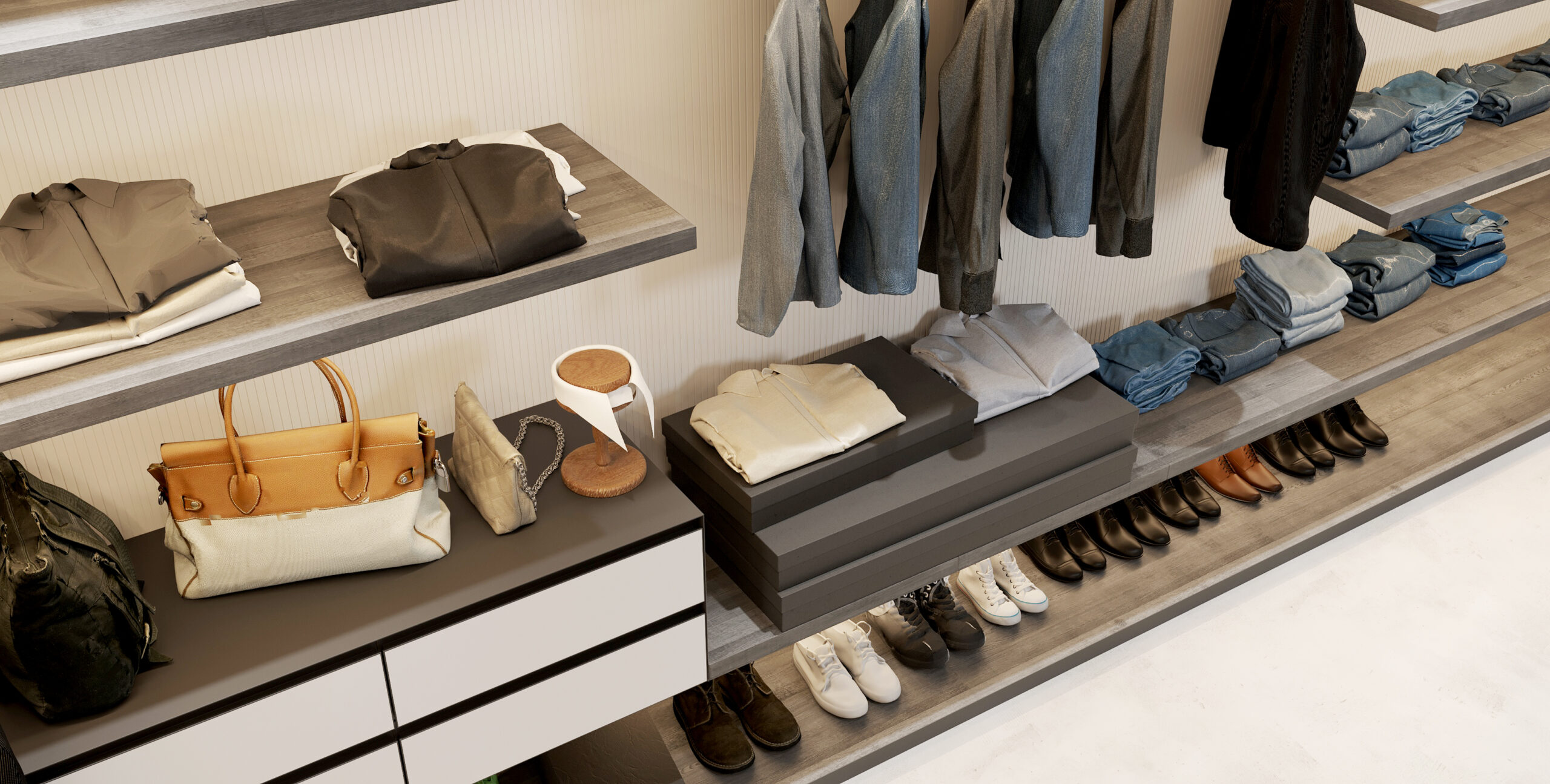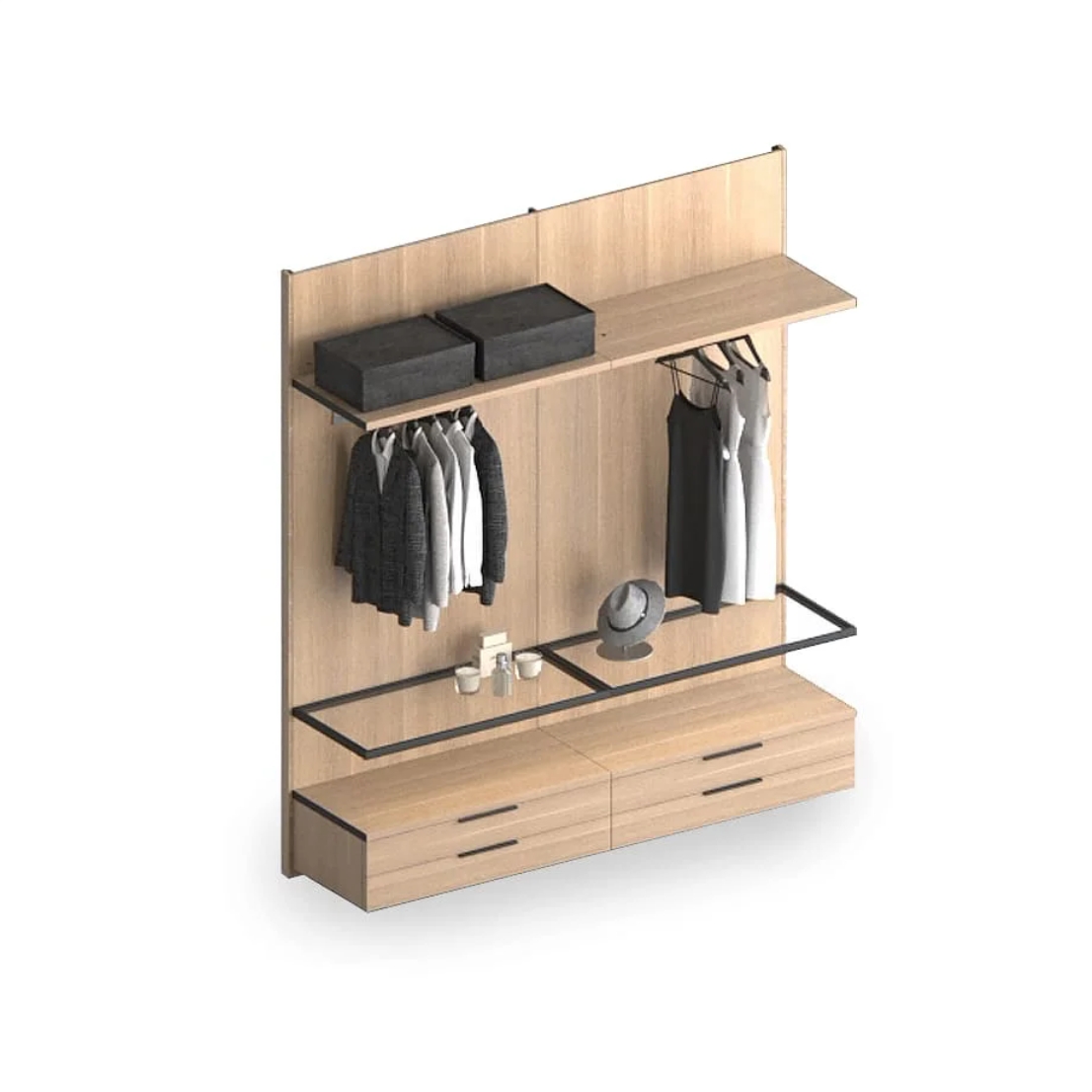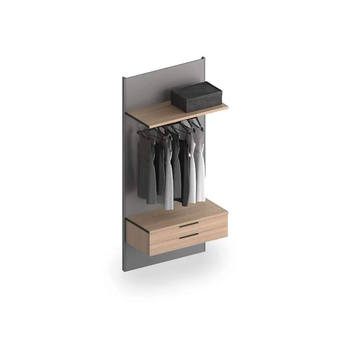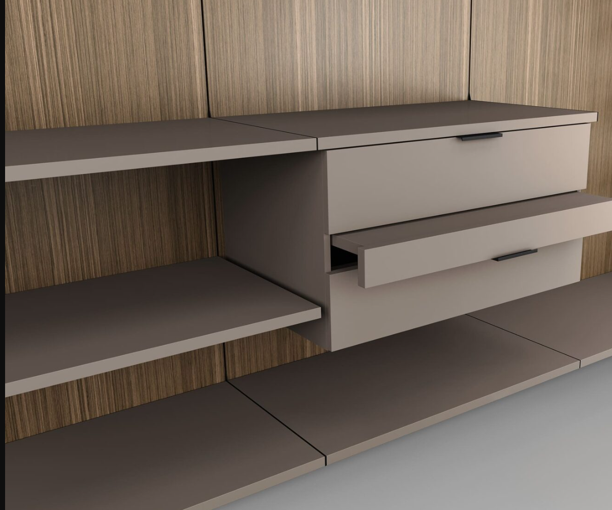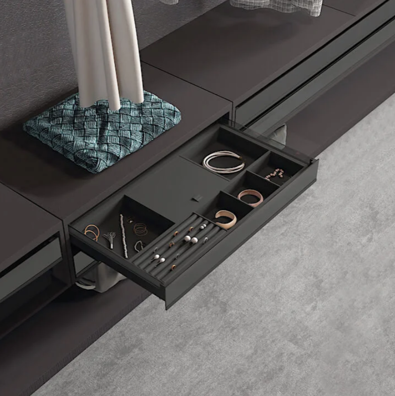 Навесные гардеробные GARDEROB-PRO — это идеальный выбор для тех, кто ценит чистую геометрию и лаконичность. Отказ от вертикальных стенок, верхних и нижних полок создаёт ощущение легкости и простора. При этом вы получаете всё необходимое: выдвижные ящики, модули для хранения, стеклянные полки и органайзеры. Гардеробная словно парит в воздухе — и именно в этом её особое очарование.