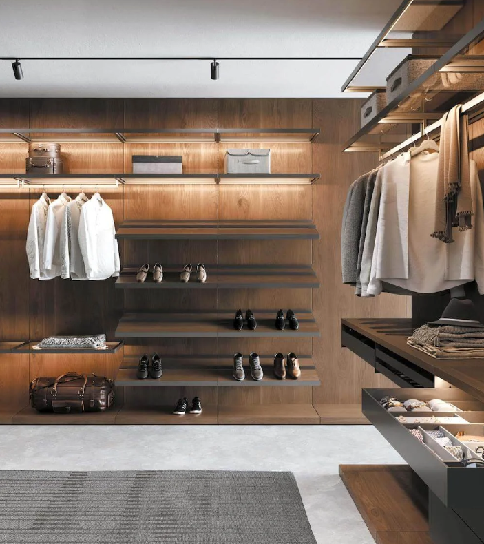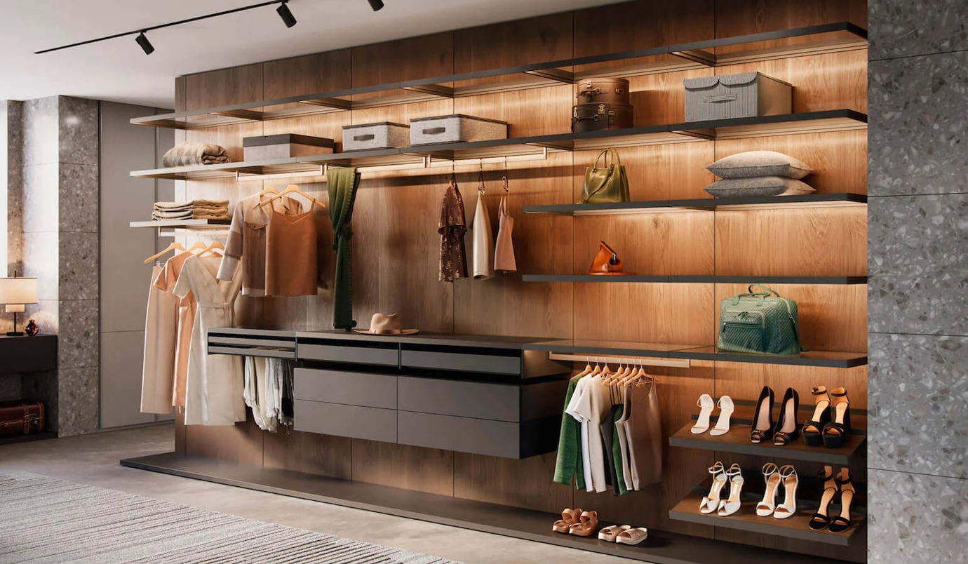 Стоимость гардеробной GARDEROB-PRO зависит от выбранных материалов и легко адаптируется под ваш бюджет. Практичные — меламиновые панели, прочные и износостойкие. Премиальные — шпон, эмаль, экокожа, стекло и алюминиевые профили для полок и фасадов.