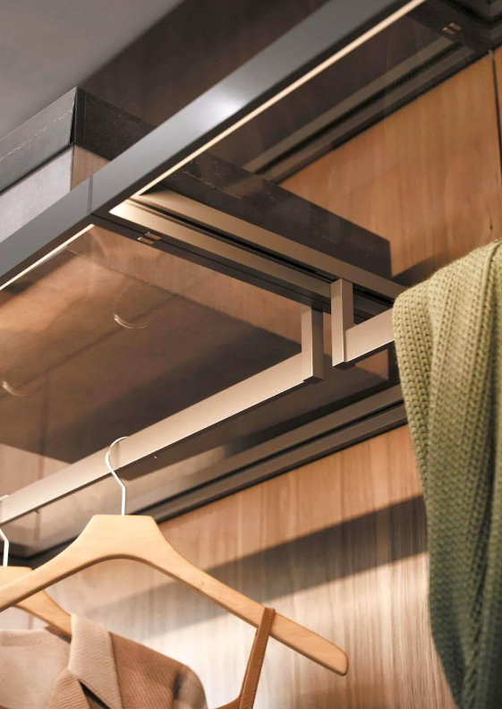 Подсветка встроенная в полки и профили, подчеркивает прозрачность и структуру гардеробной. В темное время суток система превращается в световой объект, добавляя интерьеру атмосферности и глубины.