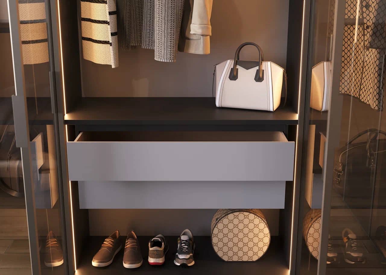 Стоимость гардеробной GARDEROB-PRO зависит от выбранных материалов и легко адаптируется под ваш бюджет. Практичные — меламиновые панели, прочные и износостойкие. Премиальные — шпон, эмаль, экокожа, стекло и алюминиевые профили для полок и фасадов.